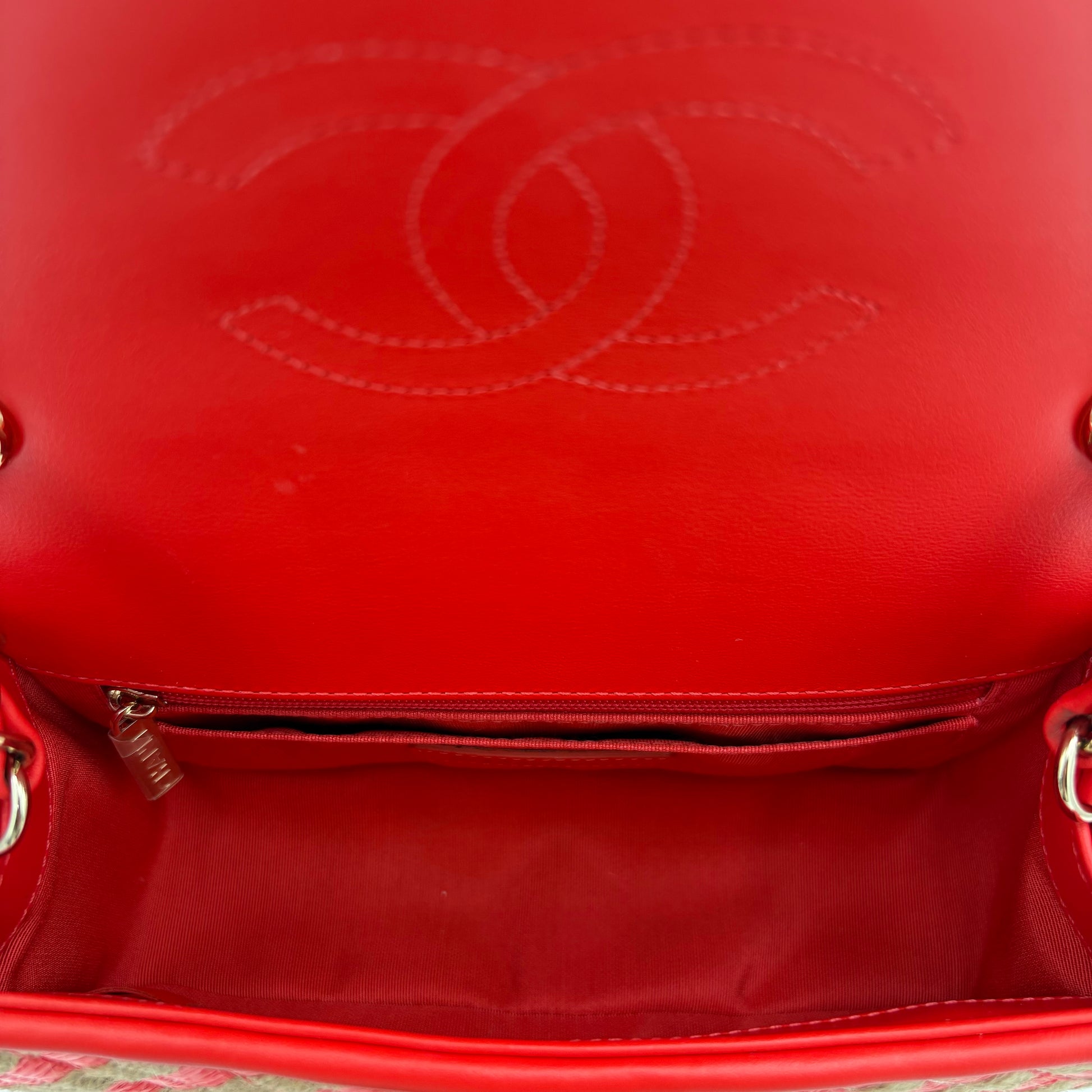 - Signature Chanel double-flap closure with classic interlocking CC logo