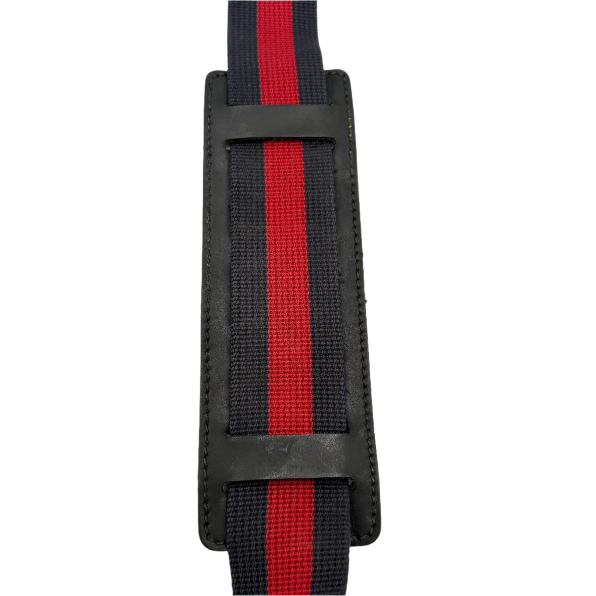 - Adjustable nylon web shoulder strap, leather-padded and accented with red-blue stripe