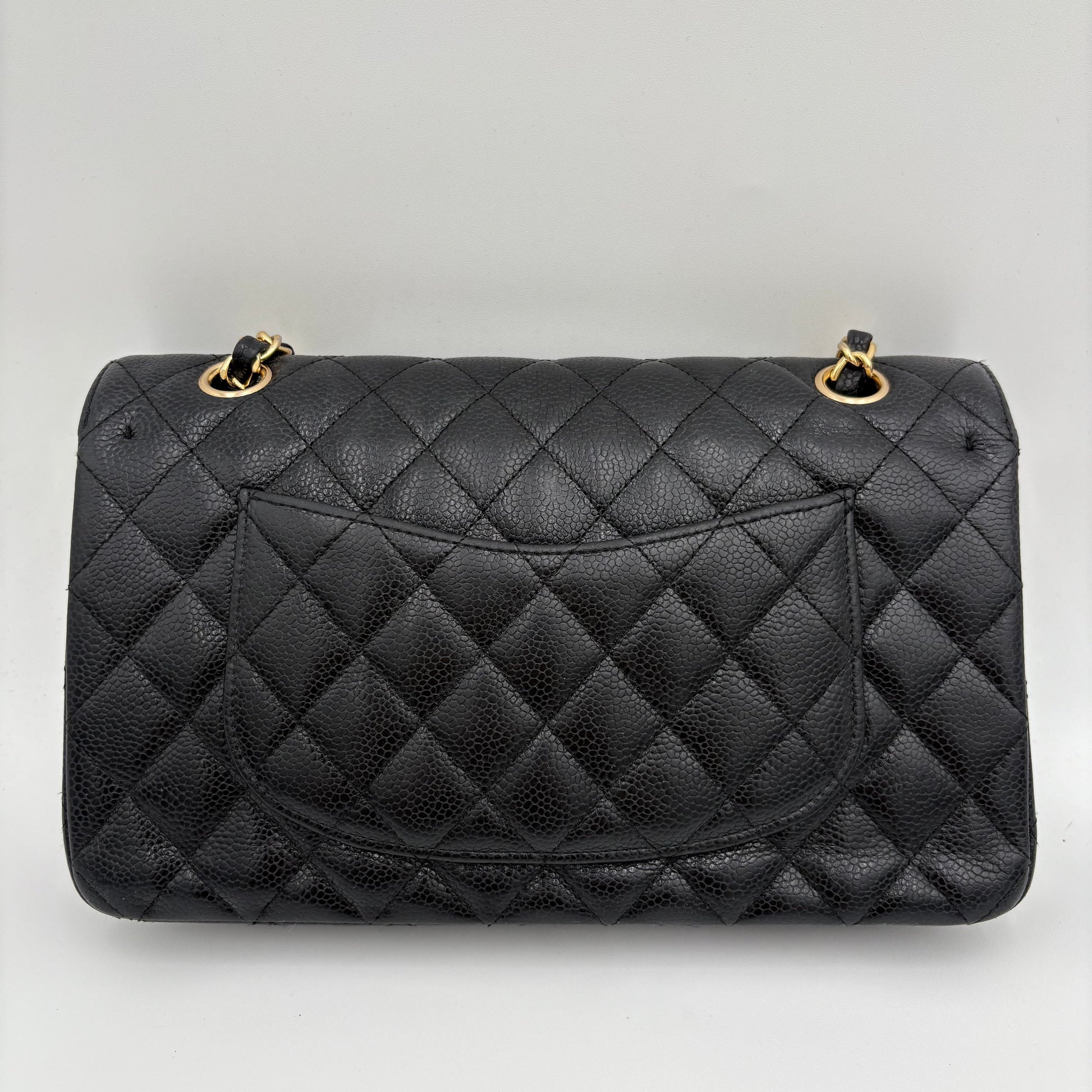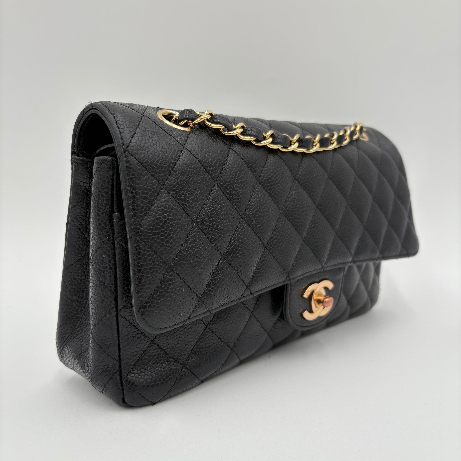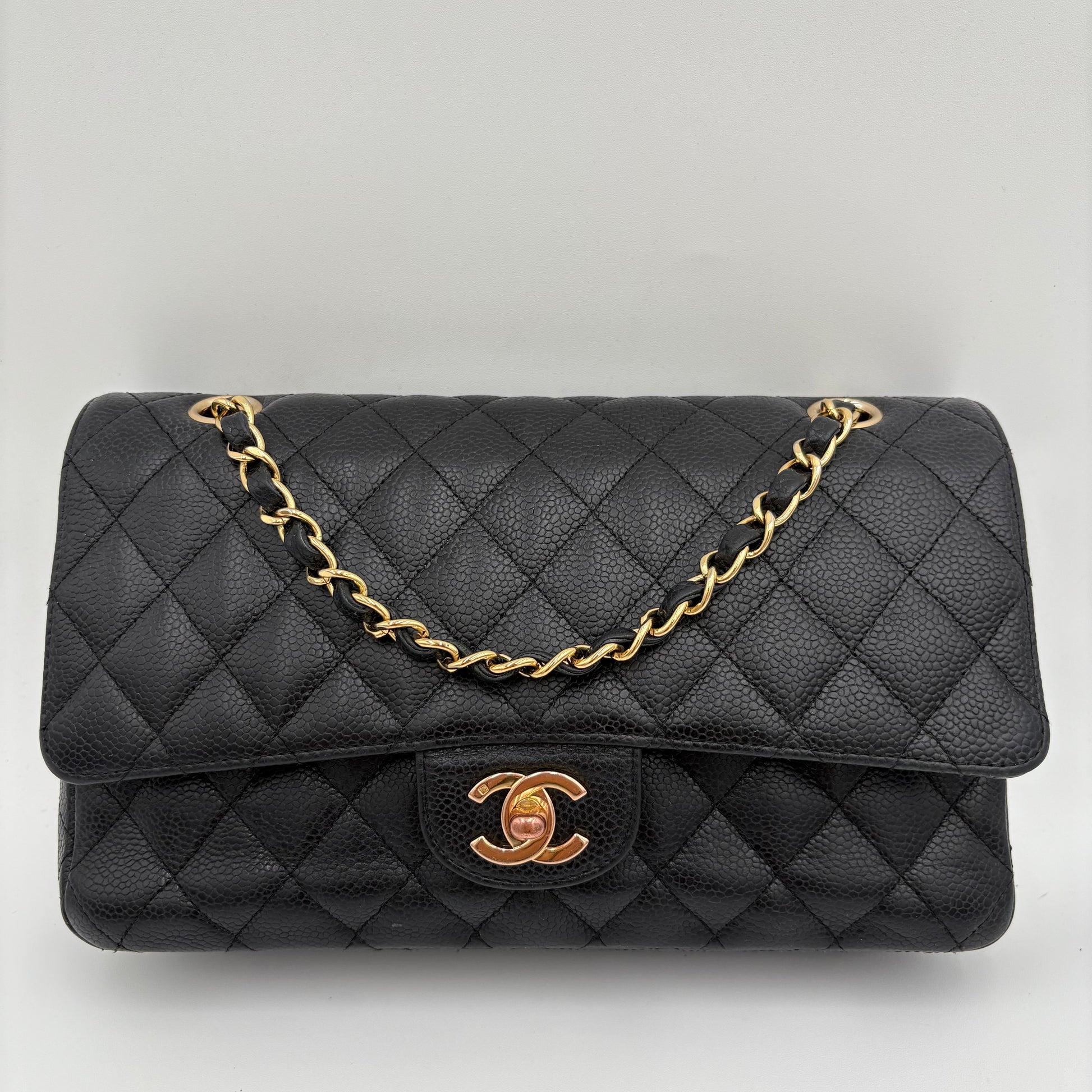 Made from caviar leather — durable, pebbled, and structured - Features 24K gold-plated hardware (pre-2008), with a rich warm gold tone